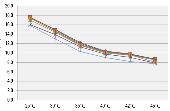两种墨水都有比较宽的粘度范围,一般是4~20厘波;但是常规来说UV从固含量来看远远大于弱溶剂。故此正常情况下UV墨水的粘度应该大过弱溶剂墨水比较多。当然粘度会受到温度影响比较大。究竟有多大?后面有一个专门的图供大家参考。更多的粘度细节我们不深究,就正常情况而言UV墨水的粘度大于弱溶剂的粘度就够了。